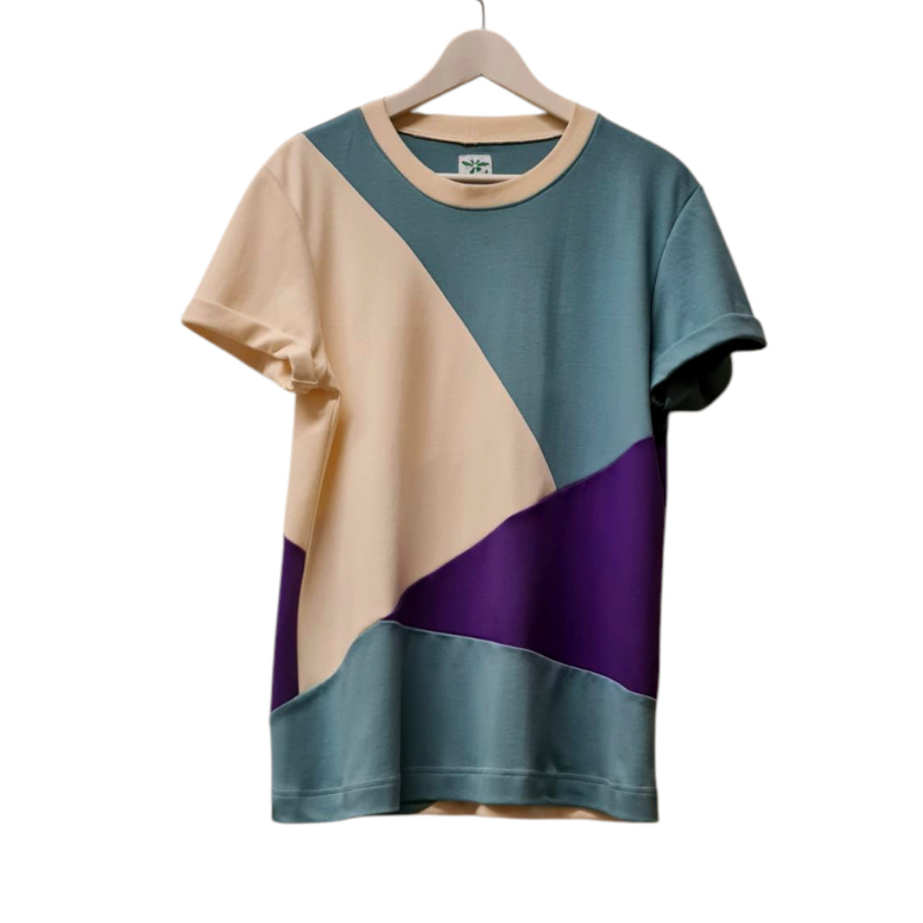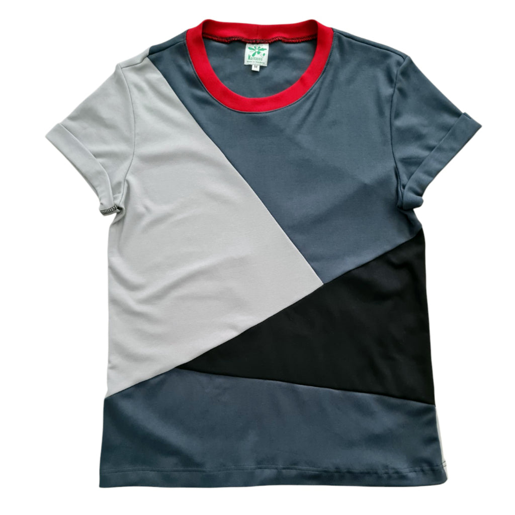 Der Schnitt dieses Shirts ist so konstruiert, das fast der gesamte Stoff verwendet wird. Durch die kleinen Schnittteile aus denen sich das Shirt zusammensetzt können selbst kleinste Stoffteile noch vernäht werden.